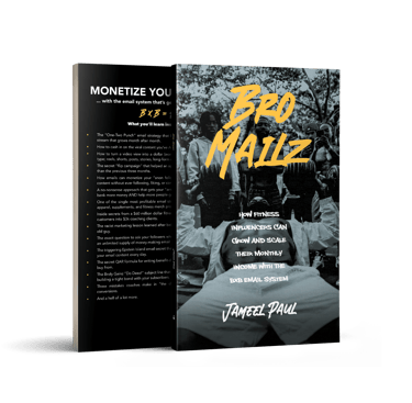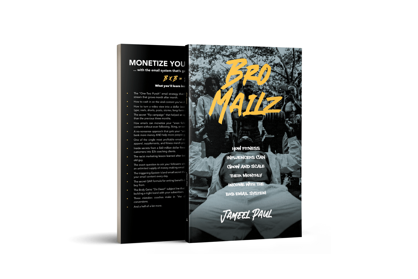 When you download BroMailz you’ll have access to THREE things: (1) A digital copy of the BroMailz book (that currently sells for $14.73 on Amazon), (2) a printable action guide walking you through the “Eleven Key Steps” in the book, and (3) a 2+ hour video training - where Jameel will give you specific examples on how to set up the BXB Email System in your fitness business.